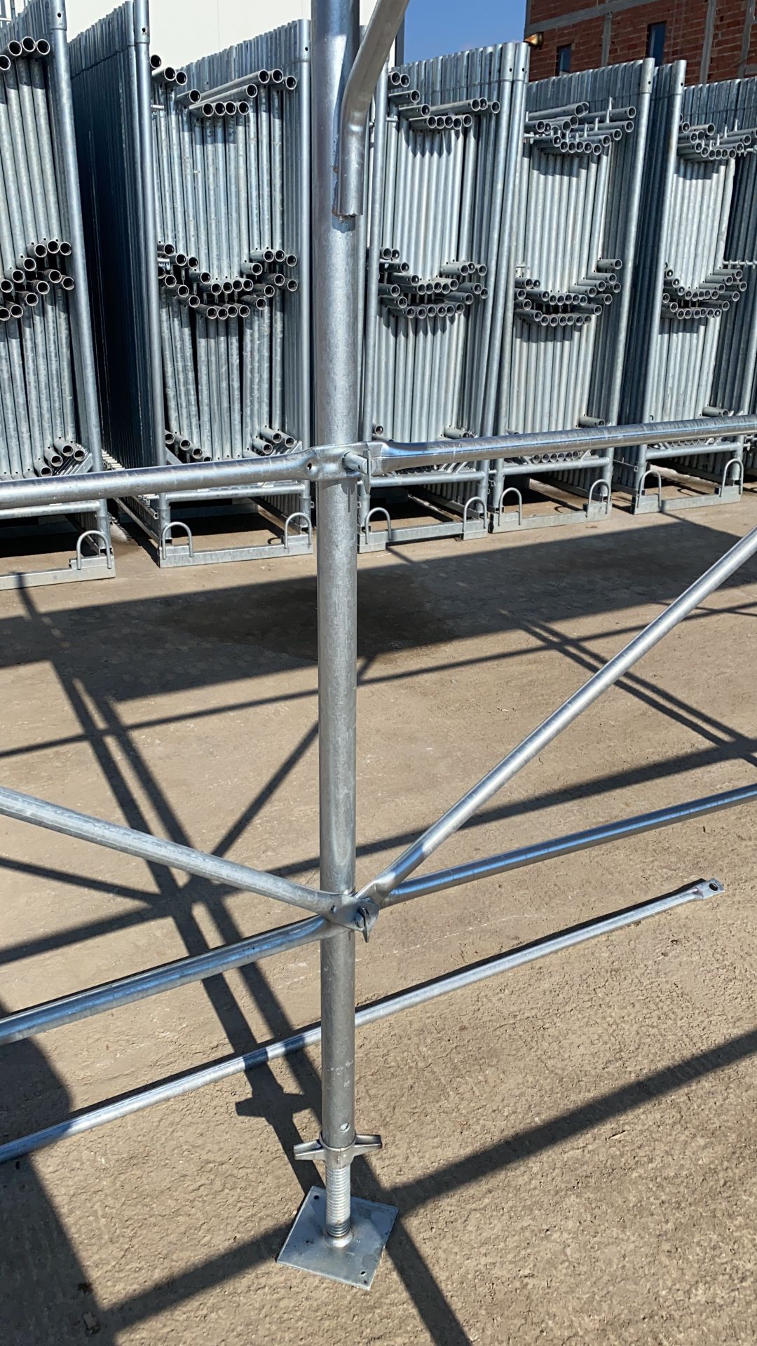 Safety Facade Scaffolding , consists of vertical frame, horizontal element, diagonal element, walking platforms, covered ladder platforms, adjustment shafts and toeboard elements. Safe scaffolding provides a practical, economical and fast solution for facade sheathing, coating, painting, restoration and many other works. Installation and disassembly is quite simple. Production is carried out in accordance with European and World standards. Frames are produced from Ø 48×3 mm steel pipes in accordance with EN 12810 and EN 12811 norms.